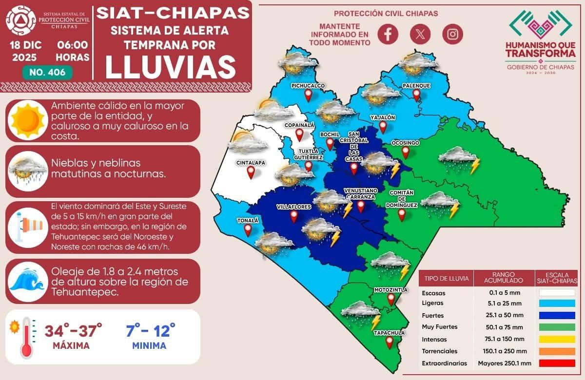Hoy, 18 de diciembre de 2025, el Sistema de Alerta Temprana por #Lluvias (#SIAT) de #ProtecciónCivil Chiapas emite el pronóstico de lluvias en nuestro estado. Alertas por colores: Muy fuertes (51 a 75mm): Meseta Comiteca, Selva, Sierra y Soconusco. Fuertes (25.1 a 50 mm): Altos, Frailesca y Llan...