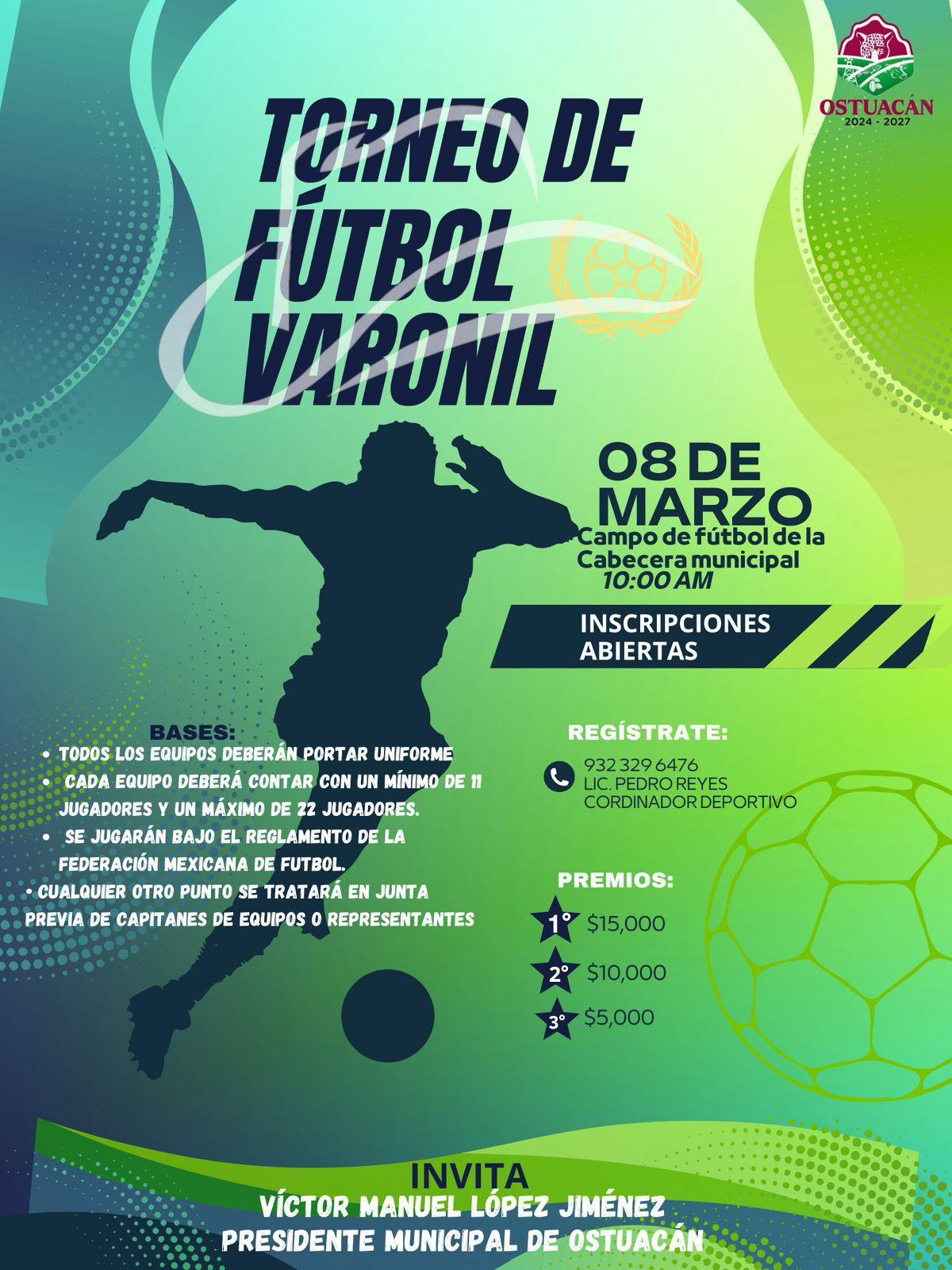 El H. Ayuntamiento de Ostuacán, que dirige el presidente municipal el MVZ. Victor Manuel Lopez Jimenez, les hace una atenta invitación a participar en el "Torneo de Fútbol Varonil" ...