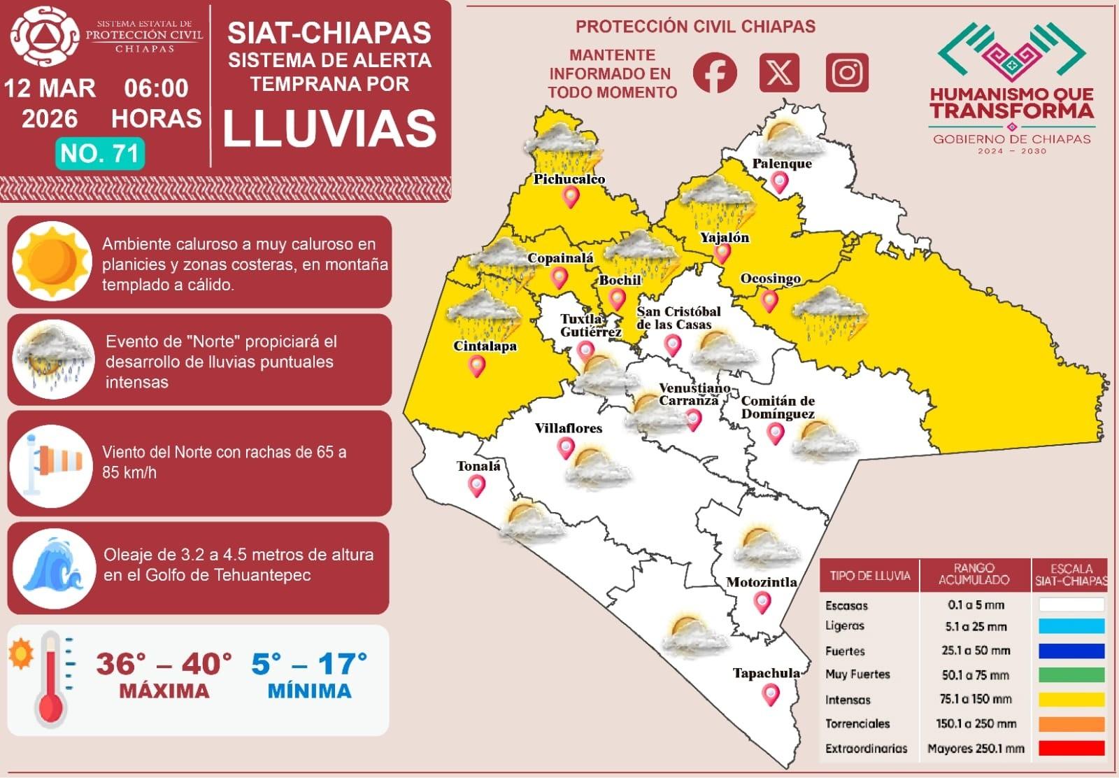 Hoy, 12 de marzo del 2026, el Sistema de Alerta Temprana por #Lluvias (#SIAT) de #ProtecciónCivil Chiapas emite el pronóstico de lluvias en nuestro estado. Alertas por colores:Intensas (75.1 a 150 mm): Norte, Valles Zoque, Mezcalapa, De los Bosques, Tulijá Tseltal Ch'ol y Selva Lacandona.Así com...